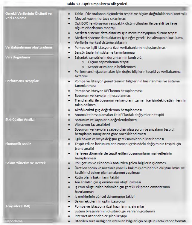 OptiPump sistemini oluşturan bileşenler ile bu bileşenlerin görevleri ve kabiliyetleri aşağıdaki tabloda özetlenmiştir.